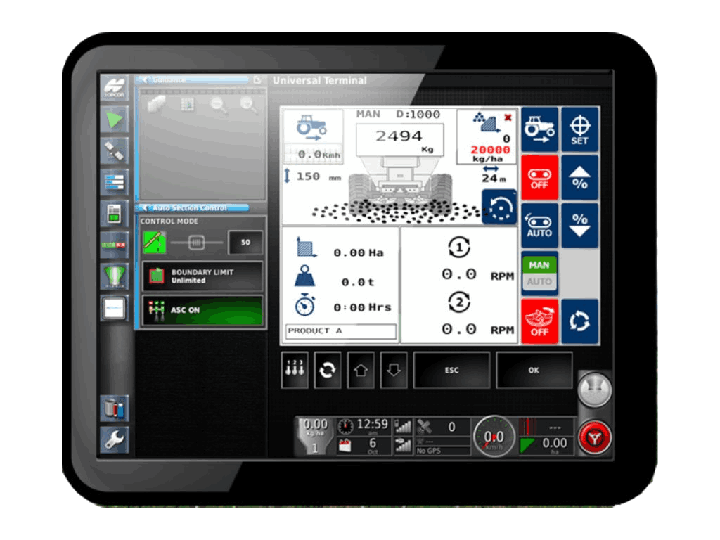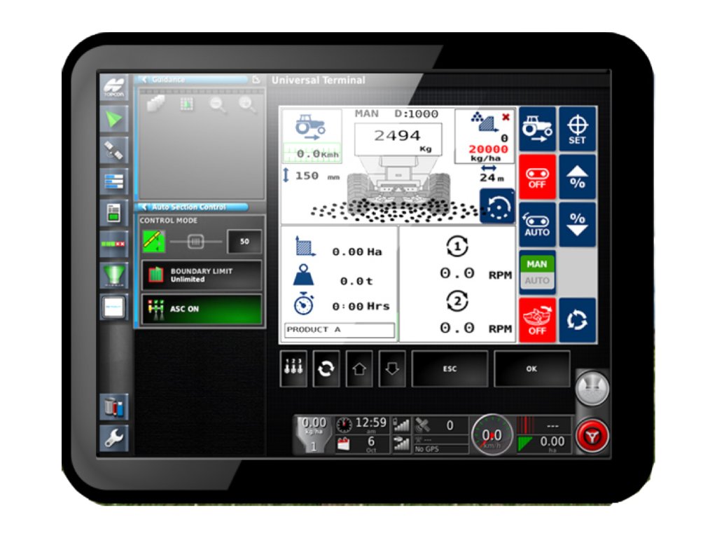 | Principe Régulation automatique proportionnelle à la vitesse avec possibilité d’application à dose variable via cartographie GPS*. *Activation soumise à déverrouillage. Équipements de série • Capteur GPS • Capteur niveau trémie • Contact en travail Interface • Écran tactile couleur 4,3” • Navigation simplifiée • Affichage clair et intuitif : fonctions avancées • Réglage en kg/ha ou graines/m² • Fonction Pré-départ (distribution immédiate à l’entrée en travail) • Rate Nudge (ajustement instantané par incréments) • Alarmes vitesses mini / maxi • Suivi surface (ha), produit distribué (kg), heures moteur • Compteurs partiels, chantier et total général • Kit ISOBUS disponible • Interrupteur marche/arrêt standard Pour qui ? ✔ Agriculture de précision ✔ Exploitations grandes cultures intensives ✔ Gestion par cartes de modulation ✔ Optimisation des intrants |